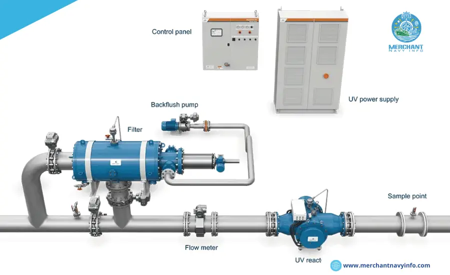 A typical ballast water treatment system on a ship Most ballast water treatment systems. Use two or three disinfection methods in different stages. A typical ballast water treatment plant consists of two stages. Where physical separation is used in the first stage and disinfection techniques in the second stage. The choice of a combined treatment system depends on various factors such as the type of ship, the available space on board and, also as already mentioned, cost constraints. A typical ballast water treatment system on a ship looks like this: also Every month, several new technologies for ships’ ballast water treatment are launched on the market.